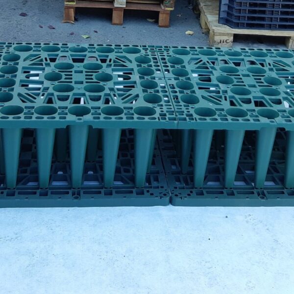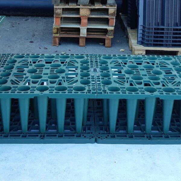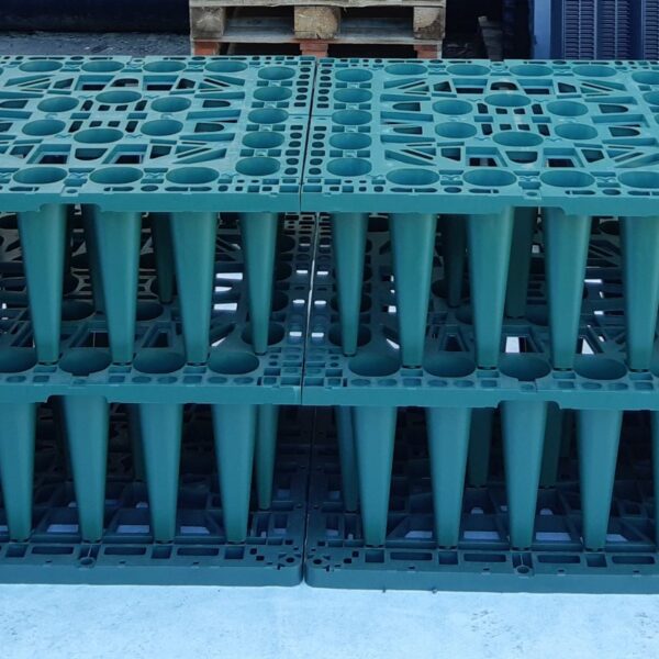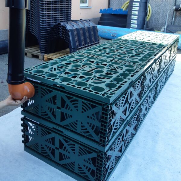 A gödör aljára lefektetjük a megfelelő méretű geotextíliát, majd lerakjuk az alaplapokat és az összekötőkkel egymáshoz fogatjuk őket – oldalanként 1 darabbal.