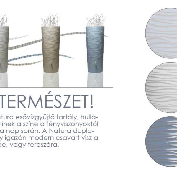 Bemutatkozik a Natura esővízgyűjtő tartály, hullámos textúrával, „tengerpart” színben, aminek a felülete a fényviszonyoktól függően változik a nap során.
