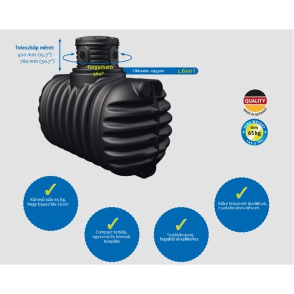 - Alacsony, mindössze 65 kg-os súly (1600 l). Könnyű kezelés a földbe történő telepítés során