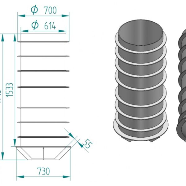 A termékek több méretben, különböző átmérőkkel (DN500, DN600, DN700, DN800) és mélységgel készülhetnek, melyek alapanyaga fekete színű polietilén, UV stabilizált, talajban kialakuló korróziós és kémiai hatásoknak ellenáll.