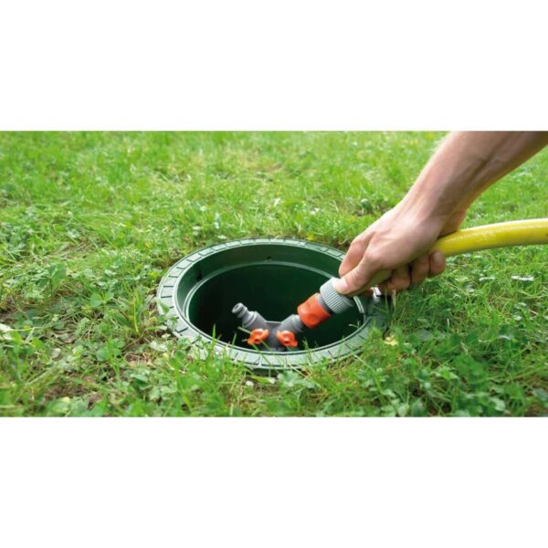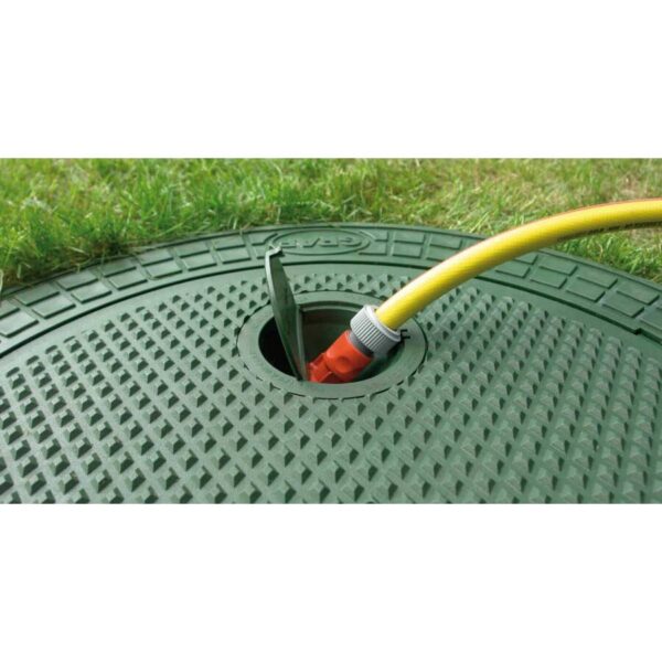 Külső vízkivételi aljzat a csomagban! Bárhol elhelyezhető az esővíz kényelmes kinyeréséhez a kertben, pl. pázsit közepén, vagy a kert másik végében. Két csatlakozó szelep a szabványos tömlőcsatlakozásokhoz.