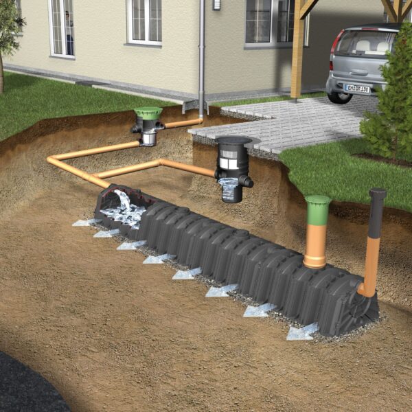 Első lépésként ki kell ásni a telepítendő rendszerhez megfelelő méretű gödröt, a rendszer méretei, elrendezése és a kívánt terhelhetőség függvényében (lásd telepítési útmutató).