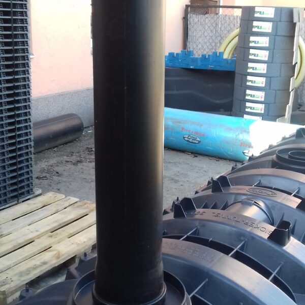 Kivágjuk a geotextíliát a csőbekötés megfelelő helyeinél és csatlakoztatjuk a befolyó csövet, a szellőztető csövet és a betekintő aknát.