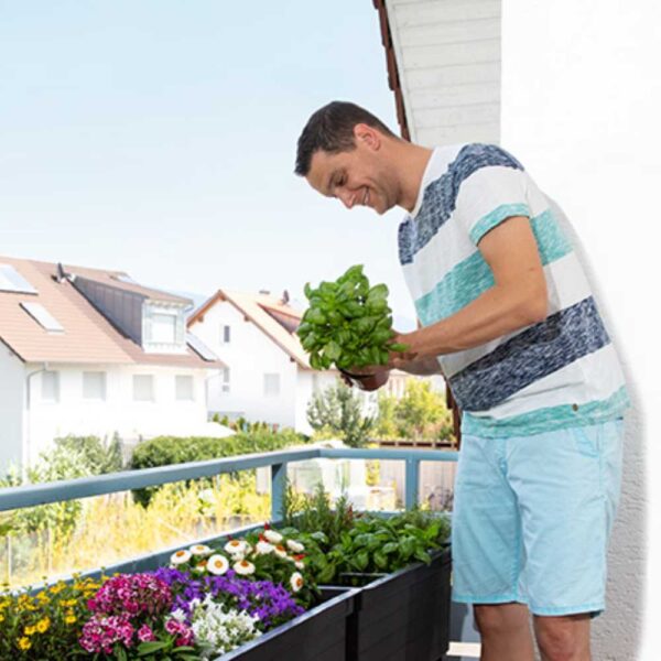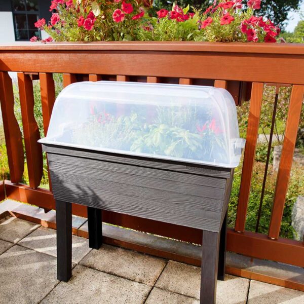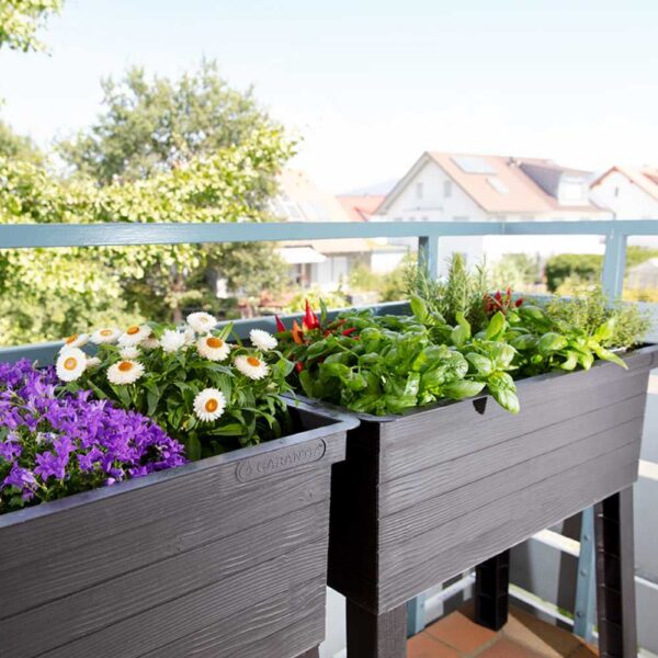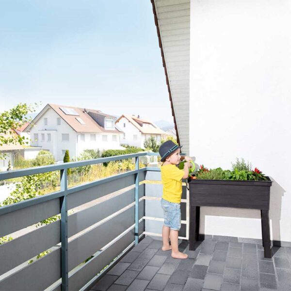 Praktikus, 100%-ban saját újrahasznosított anyagunkból, fahatású magaságyás erkélyekre, teraszokra. Lábakkal célszerűebben alkalmazható, nem kell hajlongani hozzá, de lábak nélkül is használható.